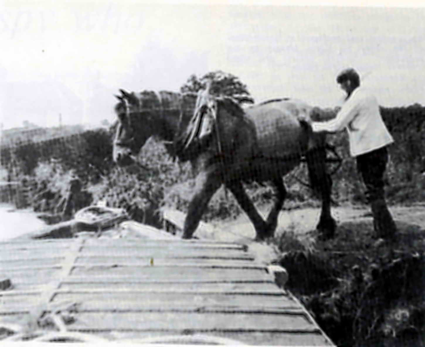 The biggest problem faced by the navigation was the fact that the landowners were very wary of the scheme and, in many cases, refused to allow a towpath to be made. This meant that the towpath kept changing banks of the river, and the horses had to be trained to leap onto the barges to be transported to the other bank. The leading boat contained a small platform at the bows to enable the towing horse to be ferried across the river when the tow path crossed from one side to the other. This occurred thirty-three times on the trip from Sudbury to Brantham. At Bures, the towpath changed side six times. The horses were, of course, specially trained.