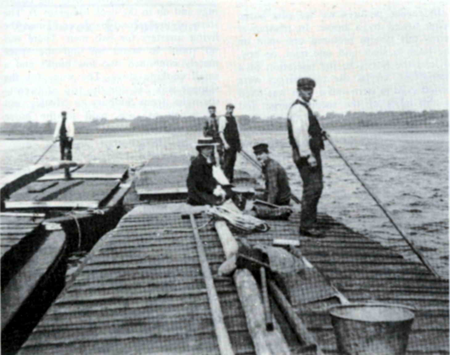 In due course, at around the beginning of the nineteenth century, it became apparent that a single horse could tow two barges, so the characteristic 'Stour Gang' was invented, where two barges were attached together. Constable's picture "View on the Stour with Flatford Old Bridge" c. 1827. shows an early version of the system. This unique system was still in use when the navigation ceased. To make up a 'Stour Gang', two barges were lashed stem to stern. A tiller was then fixed to the bows of the second barge and extended to the middle of the leading barge. A small hole was left in the hatchway in the middle of the first barge and the skipper stood in this recess to steer the two, using the second barge as a rudder while the horse was towing the pair along the river. It made for a very maneuverable load around the twisty parts of the river. The stern of the second barge contained the cramped living quarters for two men. There was no room to stand up and the space merely contained two low bunks and a small cooking stove. In Nayland, there was a hostel for the overnight stop, and the local pub had a good trade from the Navigation.